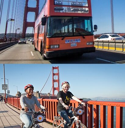 From downtown San Francisco, you can reach the Golden Gate Bridge by bus, rideshare, or tour. The Golden Gate Transit Bus 130 or 150 takes you directly to the Welcome Center stop. Muni’s 28 and 28R lines also connect to the bridge area. If you’re biking with Bay City Bike, many of our routes take you straight from Fisherman’s Wharf to the bridge via the scenic waterfront path.